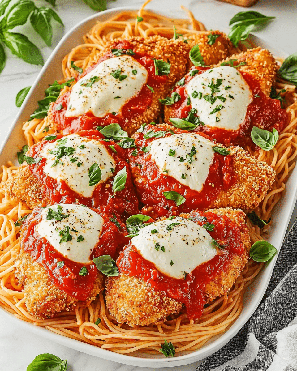 Eggplant Parmesan: Replace the chicken with 1/2-inch thick slices of eggplant for a vegetarian alternative. Salt the eggplant slices and let them sit for 30 minutes before patting dry and proceeding with the recipe.