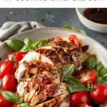 A fresh and elegant Chicken Caprese made with juicy seared chicken breasts topped with melted mozzarella, ripe tomatoes, fragrant basil, and a sweet drizzle of balsamic glaze.