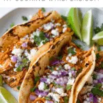 I warm the tortillas on the stovetop or wrap them in a damp paper towel and heat them in the microwave. Then I fill them generously with shredded chicken and add my favorite toppings before serving.