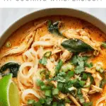 ▢1 tablespoon olive oil ▢1/2 medium onion chopped finely ▢1 teaspoon grated fresh ginger ▢3 cloves garlic minced ▢4 heaping tablespoons Thai red curry paste see note ▢4 cups chicken or vegetable broth ▢2 cups water ▢Juice of 1 lime ▢3.5 ounces uncooked rice noodles see note ▢1 (13.5 ounce) can full fat coconut milk ▢2 cups shredded cooked chicken (I used rotisserie) ▢Generous handful fresh basil torn ▢Handful fresh cilantro chopped ▢Chopped scallions to taste ▢Salt & pepper to taste ▢Lime wedges for serving (optional)
