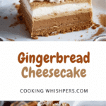 A rich and creamy holiday cheesecake infused with warm gingerbread spices, molasses, and brown sugar, set on a ginger cookie crust and topped with fluffy cinnamon whipped cream.