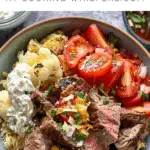 To assemble the bowls, I add air-fried cauliflower, sliced lamb, cucumber, and cherry tomatoes. I place the garlic flatbread on the side and finish each bowl with a dollop of tzatziki.