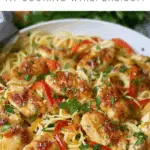 A delicious Olive Garden Chicken Scampi copycat featuring crispy, tender chicken served with colorful bell peppers, sweet onions, and a creamy garlic sauce tossed with angel hair pasta. A comforting restaurant-style meal made easily at home in just 30 minutes.