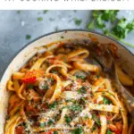16 ounces (450 g) dried pasta 2 large chicken breasts or 2 cups shredded rotisserie chicken 2 tablespoons vegetable oil (1 tbsp for frying chicken, 1 tbsp for sautéing bell peppers) 3 tablespoons jerk seasoning (1.5 tbsp for the chicken, 1.5 tbsp for the sauce) 3 bell peppers in different colors, sliced ½ cup green onions, sliced 2–3 cloves garlic, minced ¼ cup (60 ml) vegetable stock or chicken stock ½ cup (120 ml) heavy cream or half and half ½ cup (80 g) parmesan cheese, grated