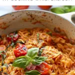 A creamy, comforting roasted tomato orzo made with jammy oven-roasted cherry tomatoes, tender orzo, and a touch of cream and Parmesan for a simple yet flavorful side dish.