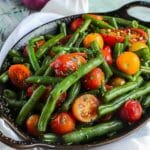 A quick, colorful, and vibrant side dish featuring tender-crisp green beans tossed with blistered tomatoes, garlic, butter, and a splash of balsamic vinegar for brightness.