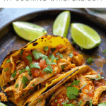 I start by putting all the slow cook ingredients into the slow cooker. I cook on HIGH for 3 hours or on LOW for 5-6 hours until the chicken becomes very soft and tender. While the chicken cooks, I make the avocado dipping sauce by blending the avocado, lime, and yoghurt in a small hand mixer or blender. I then set it aside for serving later. Once the chicken is done, I remove it to a plate and shred it using two forks. Then I return it to the sauce, mixing well to soak up all that flavor. Next, I heat a large frying pan over medium-high heat and add 1 tsp of sunflower oil. I take one tortilla and dip it into the tomato sauce to coat it in the flavorful liquid. Then I add a sprinkle of mozzarella cheese and a generous pile of shredded chicken to one side of the tortilla before folding it in half. I fry the taco on both sides for 5–10 minutes or until it’s crisp and golden. I like to press it down gently with a spatula to help it crisp up nicely. I repeat this process with the remaining tortillas, adding more oil to the pan if needed. Finally, I serve the tacos warm with the avocado dipping sauce on the side.