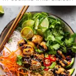 Spring Roll Bowls are a fresh, vibrant meal inspired by classic spring rolls, featuring marinated chicken, rice noodles, crunchy vegetables, fresh herbs, and a creamy sweet-and-spicy peanut sauce.