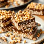 These rice krispie treats are an exciting take on the classic, offering a perfect balance of sweet, salty, and crunchy. Tahini gives a rich, nutty flavor, while the maple syrup provides natural sweetness. Topped with a layer of dark chocolate, pretzels, and sesame seeds, this recipe is both satisfying and easy to make. Plus, it’s naturally vegan and gluten-free!