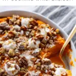 Sweet Potato Casserole is a classic comfort side dish made with creamy, savory mashed sweet potatoes, enhanced with chicken bouillon, and topped with a crunchy pecan streusel and gooey toasted marshmallows.