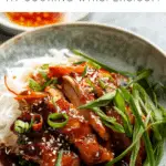 I serve the chicken hot over jasmine rice, garnished with fresh coriander, green onions, and sliced chilli for a pop of color.